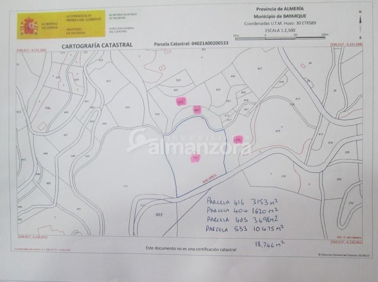 Se vende una finca con cuatro parcelas en las colinas sobre el bonito pueblo de Bayarque, aquí en el Valle del Almanzora. En el corazón de la parcela más grande, de aproximadamente 10.475 m², se encuentra una pequeña propiedad que disfruta de impresionantes vistas del pueblo y del valle. La casita cuenta con una sala de aproximadamente 20 m² con una chimenea y un porche de 8 m². Las parcelas tienen almendros y olivos, y cuentan con derechos de riego de la comunidad de la fuente de Las Parras en Bayarque. Las tres parcelas restantes colindan con la parcela principal y suman una superficie total de aproximadamente 8271 m², lo que suma un total área de aproximadamente 18 746 m².